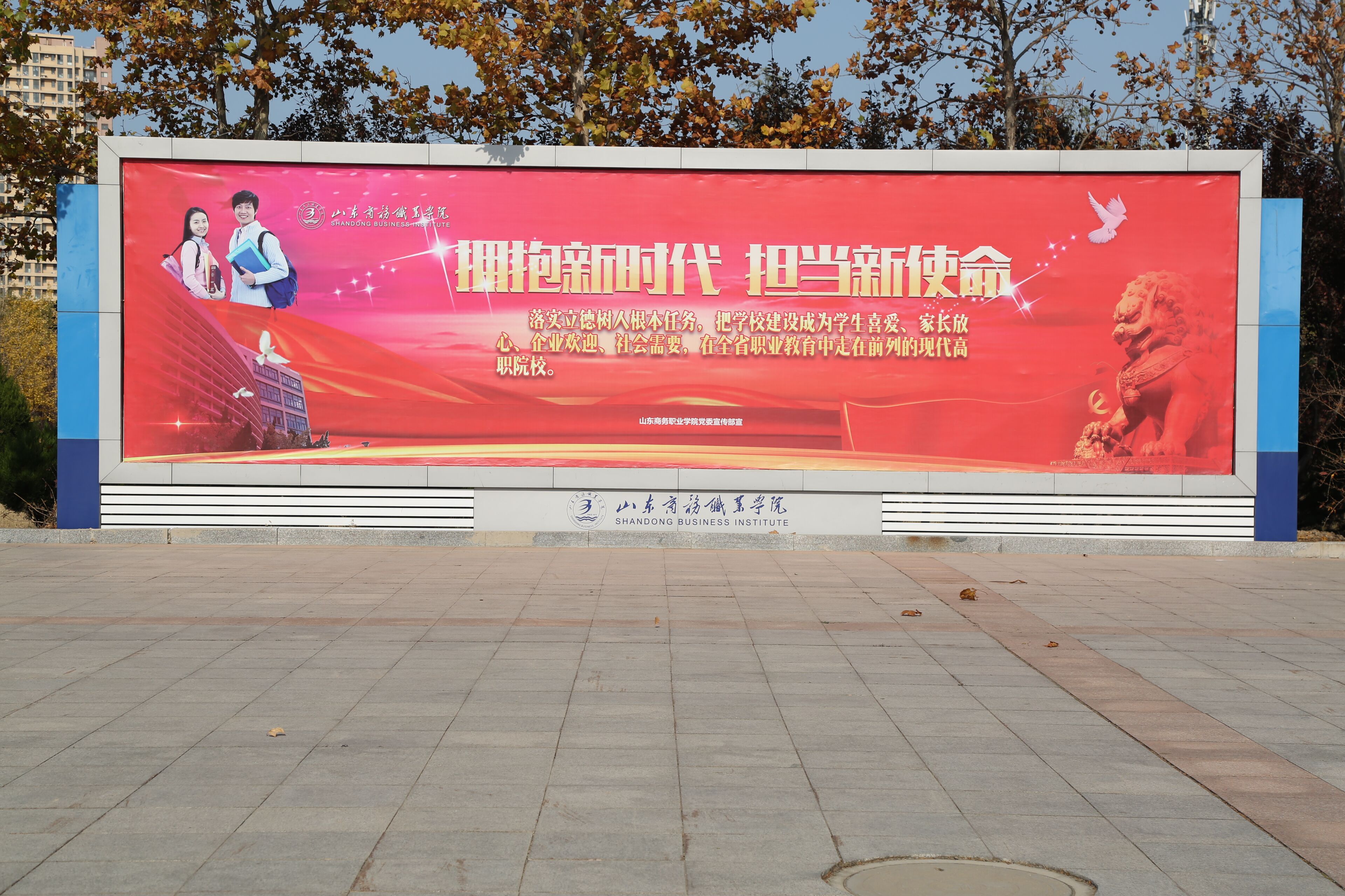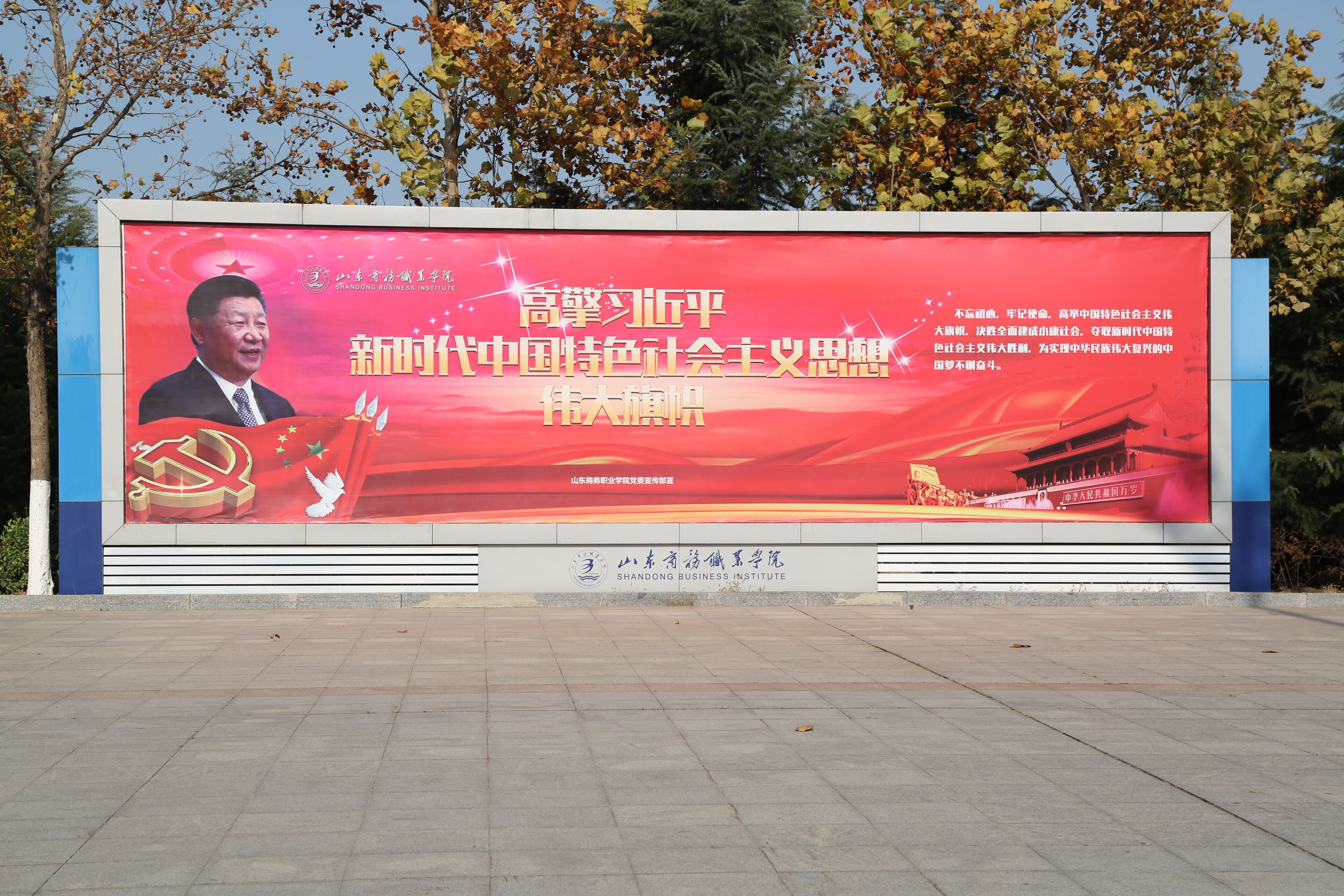 本站讯 秋末冬初的天气温暖中透着一丝的微凉,空气中饱含收获的甜蜜喜悦和对来年新的期待奋斗。走进山东商务职业学院,迎面而来的四个巨大的“十九大精神”宣传展板格外醒目,火红的底色令人振奋期许更多。继全校师生收看收听热议十九大开幕及报告阵阵热潮后,十九大盛会闭幕以来,学校党委和各单位迅速行动,把“十九大精神”的学习领会、宣传贯彻作为各部门长期重要工作,把智慧和力量凝聚到落实十九大提出的各项任务上来,全校师生以实际行动掀起学习贯彻十九大精神新热潮,推动十九大精神深入人心在校园落地生根。