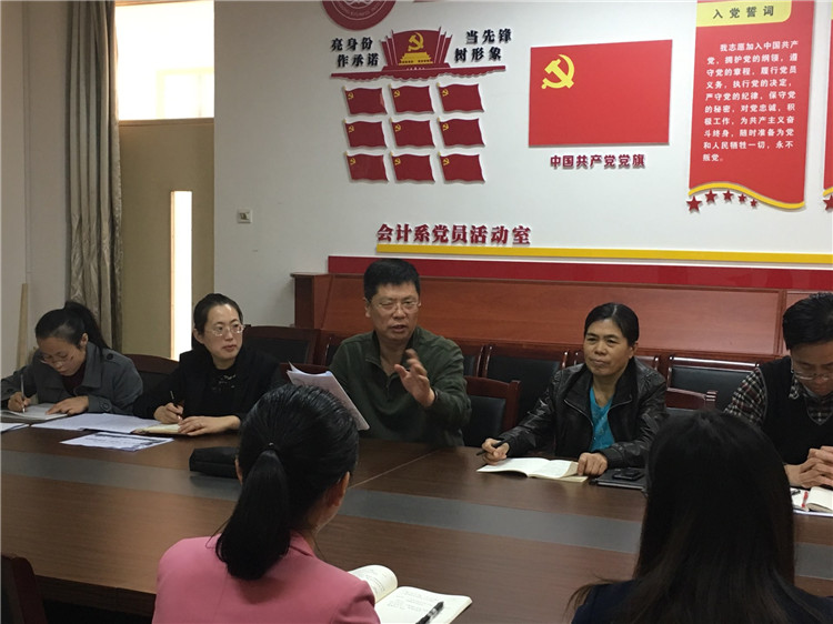 党委书记耿建敏深入会计系讲党课。10月28日,学校党委书记耿建敏深入基层党组织,在一号教学楼A301会议室,为会计系教工党支部成员上了一堂“深入学习宣传贯彻党的十九大精神,以建设过硬党支部为抓手,扎实推进学校优质高职院校建设”的生动党课。耿书记要求,建设过硬党支部,重点要做好四点工作:一是突出问题导向,要认清问题、查找分析原因,制定合理可行的措施,确保整改到位;二是强化忧患意识,要加强对有关指标、数据的定量研究,做到“胸中有数”,明确差距所在;三是增强辩证思维,在专业建设方面,要加强专业建设顶层谋划,有组织的开展教科研和技能训练打造特色专业;四是狠抓工作落实,广大党员教师要以“实”字当头、“干”字为先,做起而行之的实干家、拒当坐而论道的清谈客。