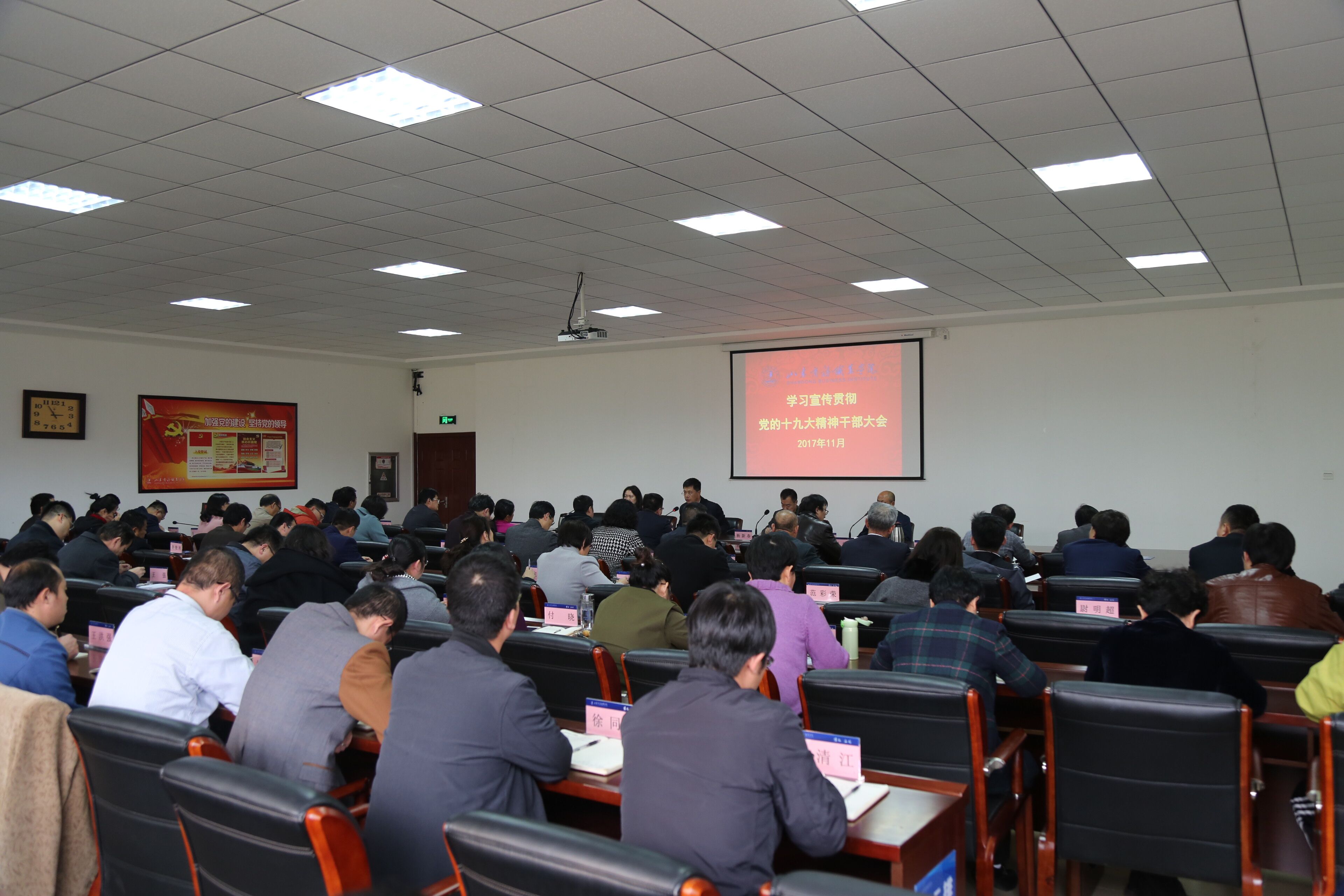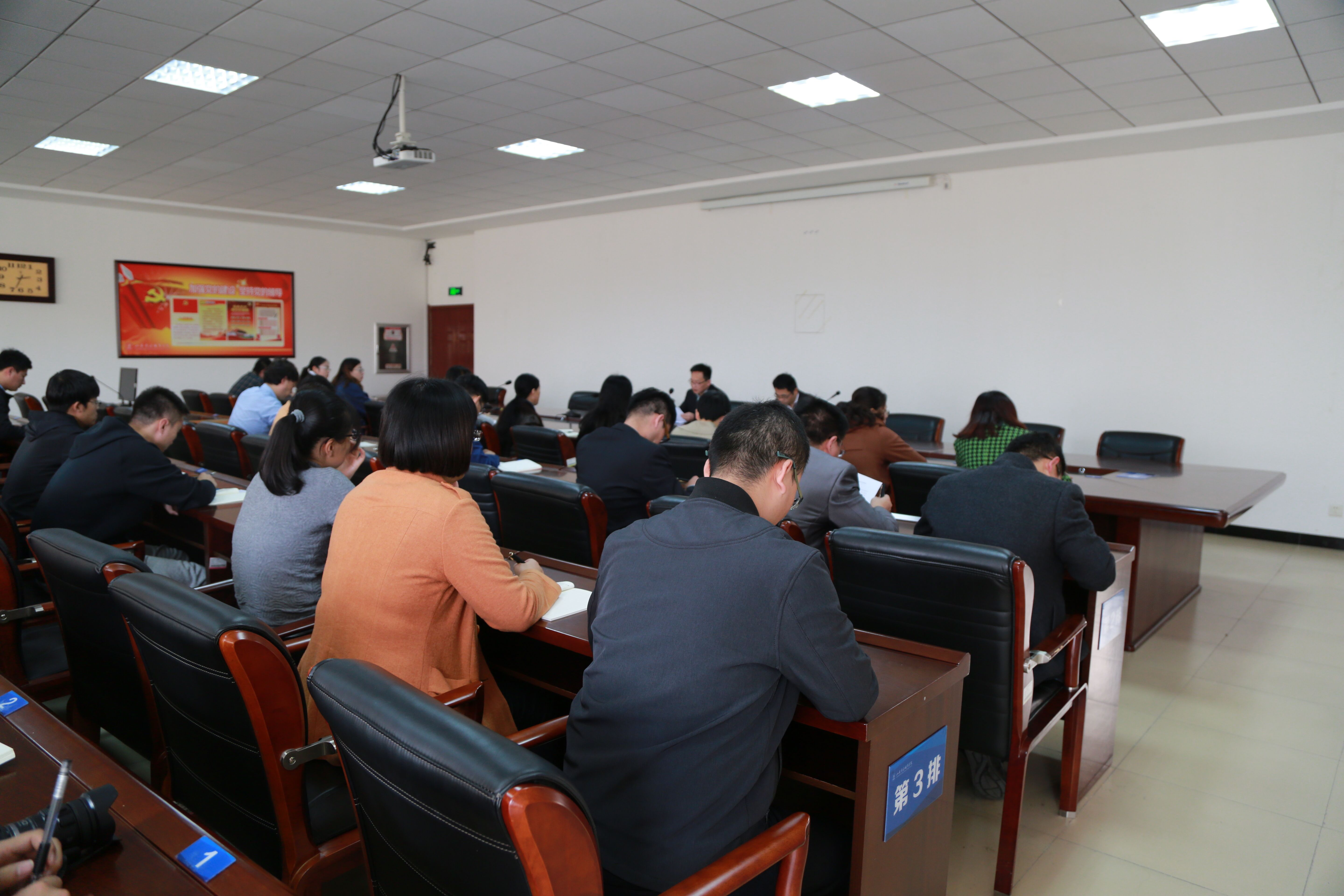 11月7日下午,召开学习宣传贯彻党的十九大精神干部大会,全体副科级以上党员干部参加会议。会上,院长杨新春同志带领与会人员学习了《中国共产党第十九次全国代表大会关于十八届中央委员会报告的决议》,回顾了十九大报告的主要思想和精彩论述。耿建敏书记对学校学习宣传贯彻党的十九大精神进行动员部署,要求全校要强化工作措施、强化组织领导、强化教育培训,通过加大宣传力度、开展调查研究和大讨论活动等举措,迅速兴起学习贯彻十九大精神热潮。