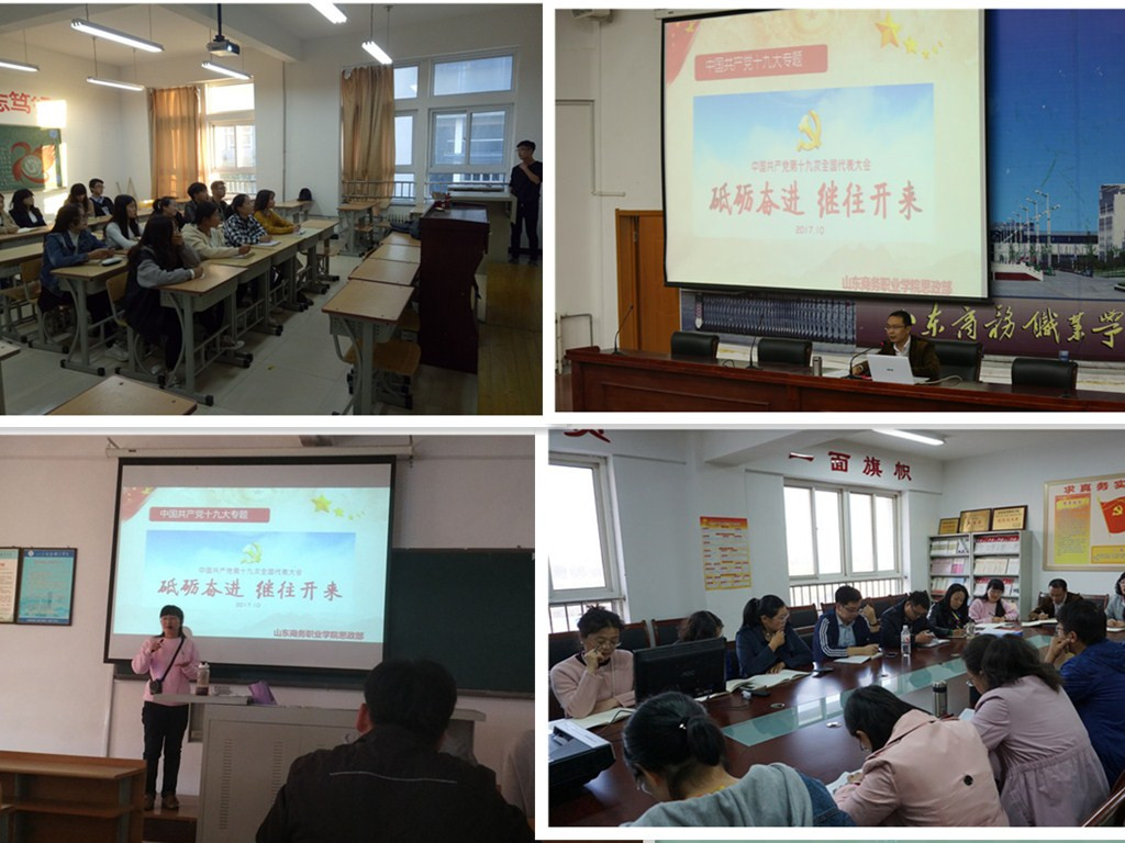 思政部多措并举学习贯彻十九大精神。一是借助“三会一课”时间,开展学习十九大报告专题研讨活动,深刻理解十九大报告的新思想、新论断、新提法、新举措;二是组织开展“十九大知识进课堂”活动,以通俗易懂、喜闻乐见的形式在思政课上开展学习十九大报告专题教学;三是利用党课培训开展宣讲,把十九大报告精神传达给每一名入党积极分子;四是开展“十九大精神入班级”活动,依托学生社团-知行社,挖掘报告中与青年大学生息息相关的精神内涵,发挥朋辈引领的作用。
