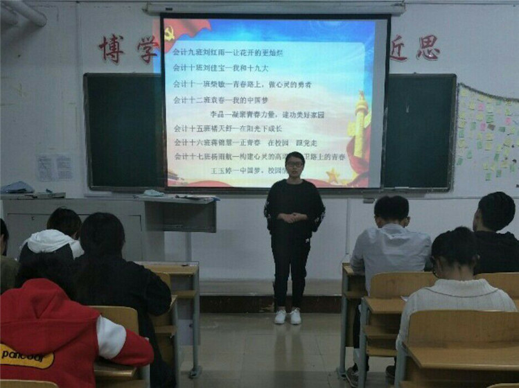 会计系激情演讲比赛推动十九大精神入班级。10月30日,在1b105举行了“我的十九大收获”演讲比赛,同学们结合自身实际,畅谈体会收获,以生动的语言,真实的情感表达要响应十九大报告提出的“不断提高自身本领,勇做时代弄潮儿”的号召。当天,会计系组织全体教职工在1A408集体学习“十九大报告40个新提法新举措”活动,深刻领会党的十九大精神。