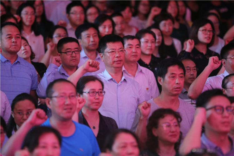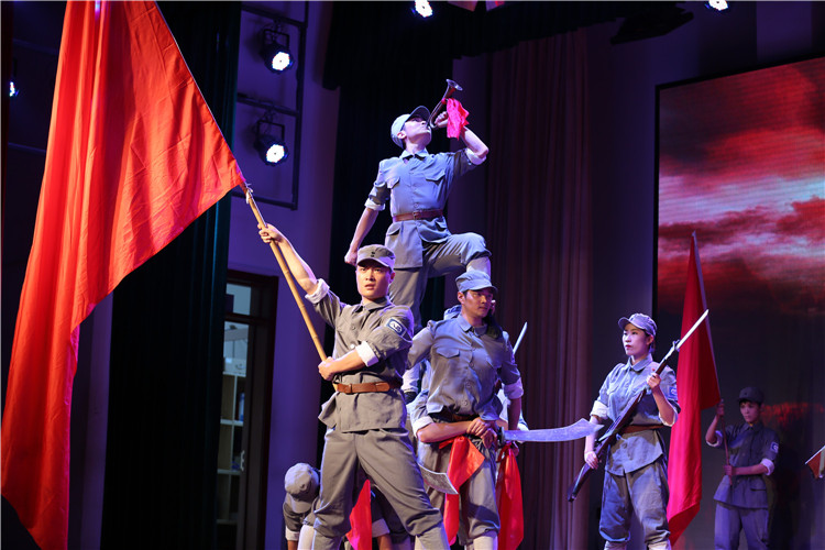 为保护八路军而献身的8岁孩子,为革命牺牲了两位子弟兵的老妈妈,23岁便献出宝贵生命猛虎斗士任常伦,一幕幕深情的演出让观众动容落泪,一个个胶东红色故事让全场师生热血满腔,在演员的带领下,全场党员起立重温入党誓词,把整个演出推向了高潮。“从小爷爷对我说,吃水不忘挖井人,曾经苦难才明白,没有共产党哪有新中国。从小老师教我唱,唱支山歌给党听,几经风雨更懂得,跟着共产党才有新中国……”在观众熟悉的悠扬歌声中,由全体歌舞演员共同参演的大歌舞《灿烂阳光》最后一个登场。闪耀着金光的铁锤镰刀,代表着民族的希望,演员们的深情表演,现场掌声经久不息。