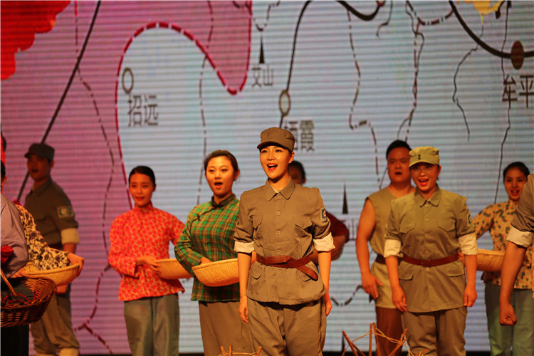 “胶东,这片温暖的土地。安宁,被列强打破;生活,被敌人践踏;家园,被无情屠戮。尸骸遍地,疮痍满目,人民流离,祸起四方,我辈当如何!”演出在有志青年深知国难当头悲愤交加的慨叹中拉开序幕,瞬间把现场观众带入了那个山河破碎的动荡年代,“山巍峨,海磅礴,胶东唱响英雄歌。天高远,地宽广,胶东红旗永飘扬……”嘹亮高亢的歌声照暖每个人的心,大家又仿佛进入了胶东地区如火如荼闹革命的战场中,风吹麦浪,胶东子弟兵昂首挺胸纵情歌唱,在广大的平原上建立了抗日的根据地。西从胶济线,东到黄海边,八百万抗日民众利用游击战将敌人打得胆寒。